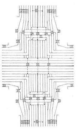 圖1是實用新型的橋體結(jié)構(gòu)圖路口的中間部位為縱向高架橋101,供縱向直行車輛通過路口,路口兩端架設(shè)縱向路面橋102(上起一高架車道),橫向中間直行車道103為雙盆形地下車道,縱向高架橋101下方隆起至地面,盆底部位上方為縱向路面橋102,車行道路不架設(shè)橋墩,縱向路面橋橋基(代橋墩)104、縱向高架橋橋基105(代橋墩)占用各轉(zhuǎn)彎掉頭車輛共用橫向車道路基??v向高架橋橋墩位于橫向道路中心線上所標(biāo)101位置。