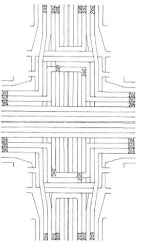 左轉(zhuǎn)彎車道的三層立交設(shè)計,兩橫向左轉(zhuǎn)彎車道202分別通過兩縱向路面橋?qū)崿F(xiàn)無交叉左轉(zhuǎn),橫向左轉(zhuǎn)彎車道分別穿越縱向路面橋上的縱向左轉(zhuǎn)彎高架車道。兩縱向左轉(zhuǎn)彎車道分別通過兩縱向路面橋上的高架車道實現(xiàn)無交叉左轉(zhuǎn)。右轉(zhuǎn)彎車道為高架,跨越縱向路面橋上的縱向電動車道人行道。各調(diào)頭車道進(jìn)出路口均為水平方向,車輛在同一平面行駛,左轉(zhuǎn)調(diào)頭,橫向調(diào)頭車道進(jìn)入路口至縱向路面橋左轉(zhuǎn)調(diào)頭,縱向調(diào)頭車道跨越橫向電動車道人行道左轉(zhuǎn)調(diào)頭,中間穿越縱向高架橋。