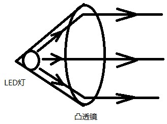 為了解決由于距離近無(wú)法看清圖像的問題,我利用用凸透鏡把每個(gè)LED燈的光線都由發(fā)散光聚焦,但并不是聚焦為平行光,而是仍略有發(fā)散,使人眼能夠看清圖像。這樣做的目的是防止不同使用者戴眼鏡位置不同而可能發(fā)生的看不清圖像的問題。如圖:
