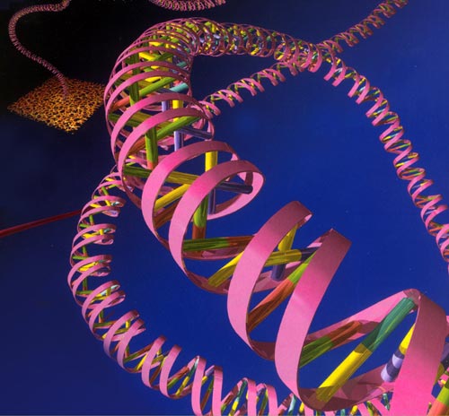 1953年4月25日,世界權(quán)威雜志《自然》雜志發(fā)表了沃森、克里克的一篇900多字優(yōu)美精煉的短文,宣告了DNA分子雙螺旋結(jié)構(gòu)模型的誕生。這個(gè)結(jié)構(gòu)模型的要義是:DNA是一個(gè)長(zhǎng)長(zhǎng)的雙鏈分子,由兩條同軸反向相互纏繞的多核苷酸鏈組成,外側(cè)是由脫氧核糖和磷酸根組成的分子骨架,中間是由互補(bǔ)的堿基對(duì)組成的階梯,堿基配對(duì)方式是A配T,C配G;堿基對(duì)間距為0.34納米,每10個(gè)堿基對(duì)形成一個(gè)螺旋周期,螺旋直徑為1納米。這個(gè)模型既能從螺旋性、分子直徑、堿基對(duì)的幾何學(xué)尺度等方面闡明X射線衍射圖像,又能以堿基專一性互補(bǔ)配對(duì)來(lái)解釋查伽夫當(dāng)量定律。DNA雙螺旋結(jié)構(gòu)是一個(gè)極為成功、無(wú)懈可擊的DNA分子結(jié)構(gòu)模型,它由兩條右旋但反向的鏈在同一個(gè)軸上盤而成,像一個(gè)螺旋形的梯子,生命的遺傳密碼就列在梯子橫檔上。據(jù)科學(xué)家統(tǒng)計(jì),一個(gè)體細(xì)胞的全部DNA“螺旋樓梯”長(zhǎng)約2米。若將一個(gè)人的全部DNA連接起來(lái),可以在地球和太陽(yáng)之間扯上80個(gè)來(lái)回。 DNA分子雙螺旋結(jié)構(gòu)模型的發(fā)現(xiàn),是生物學(xué)史上的一座里程碑; 1962年,沃森、克里克因發(fā)現(xiàn)DNA分子結(jié)構(gòu),與改進(jìn)了X射線衍射技術(shù)的威爾金斯一起獲得了諾貝爾醫(yī)學(xué)或生理學(xué)獎(jiǎng)。