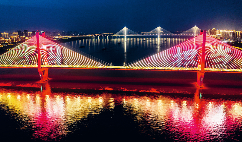 在抗擊新冠肺炎疫情的斗爭中,中國人民萬眾一心、眾志成城,凝聚起強大合力,展現(xiàn)了中國力量、中國精神、中國效率。圖為2020年5月2日晚,湖北武漢長江二橋燈光秀打出的“中國擔當”畫面。 中新社發(fā) 趙廣亮/攝