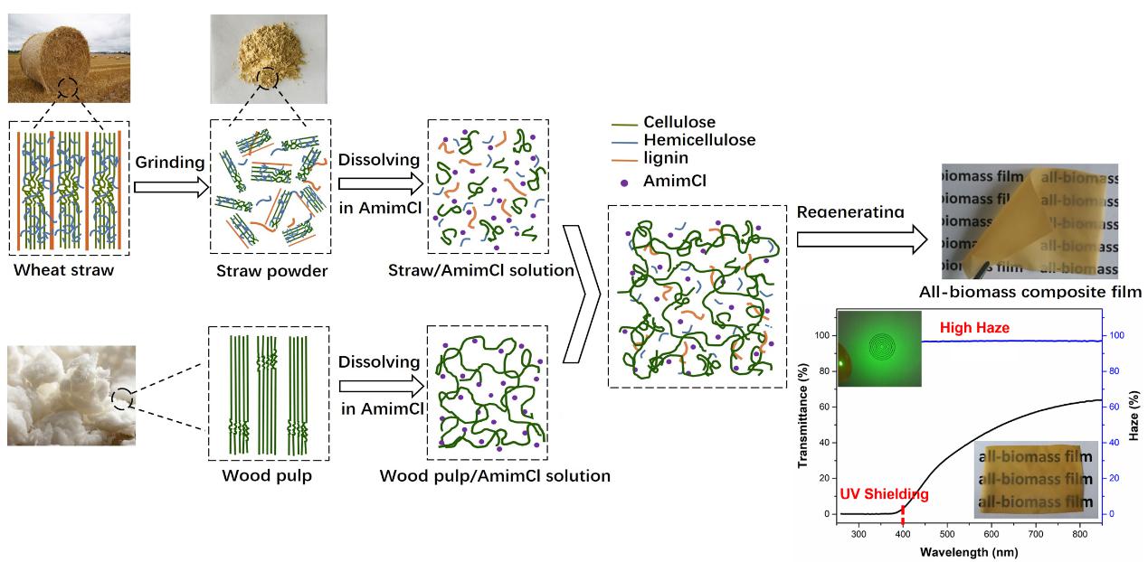 第一個(gè)是玉米秸稈直接溶解,保留里面的納米晶體結(jié)構(gòu)得到半透明的膜,強(qiáng)度可以做到50 MPa(圖3);第二個(gè)是以小麥秸稈為原料,將少量高聚合度的纖維素與小麥秸稈粉末共混后做膜,膜強(qiáng)度也大于50 MPa,這是一個(gè)非常實(shí)用的方法,加少量的高聚合度纖維素就可以將低品質(zhì)的纖維素變成一個(gè)可以用的材料(圖4)。