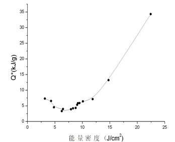 如圖3-5所示,單位面積除漆質(zhì)量先是隨著能量密度上升,在能量密度為6~8 J/cm2之間達到峰值,隨后下降。當(dāng)激光能量密度大于12 J/cm2后,單位面積除漆質(zhì)量顯著下降,此時,激光與樣品表面的作用機理可能已發(fā)生突變。而進一步分析Q*值(Q*=激光能量密度/單位面積除漆質(zhì)量)隨能量密度的變化曲線,如圖3-6所示。可以看出,當(dāng)能量密度大于10 J/cm2后,Q*值隨著激光能量密度的提高大幅提高,說明激光能量的利用效率顯著下降。且在入射激光能量密度為6.5 J/cm2時,Q*值為極小值,約為3 kJ/g。
