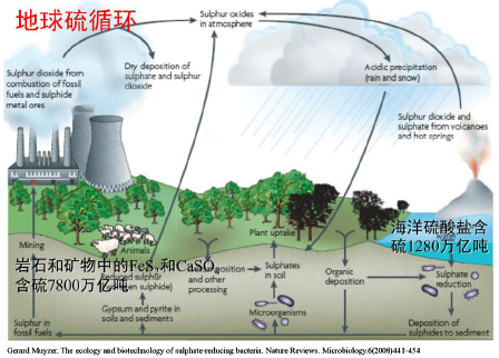 硫磺是重要化工原料,我國是硫磺消耗大國也是進(jìn)口大國,2017年我國硫磺進(jìn)口達(dá)1123.6萬噸,產(chǎn)量590萬噸。硫循環(huán)是地球三大物質(zhì)循環(huán)之一,硫各種價態(tài)間轉(zhuǎn)化的實現(xiàn)均由硫細(xì)菌來完成(圖1-1)。