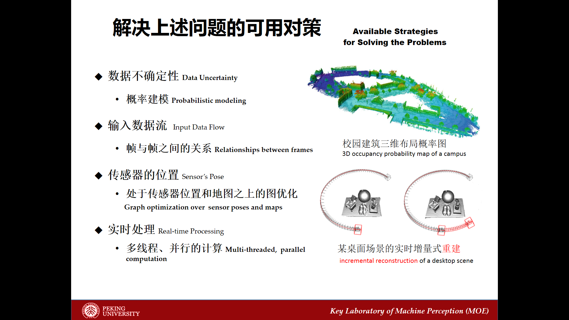 下面我再給大家具體說一下這些問題怎么解決。這里面解決了一些,從概念上非常容易想到的辦法,但是很多需要下一些功夫。數(shù)據(jù)的不確定性,我們可以用概率統(tǒng)計的方式,對數(shù)據(jù)進(jìn)行建模。數(shù)據(jù)流怎么辦?能不能很好地利用數(shù)據(jù)之間的時間的一貫性,另外用傳感器的姿態(tài)做定位,像更好的一些優(yōu)化的東西,能不能幫助我們解決優(yōu)化的問題。像實(shí)時處理,我們其他一些更好的節(jié)省計算量的方法可能要開發(fā)出來。