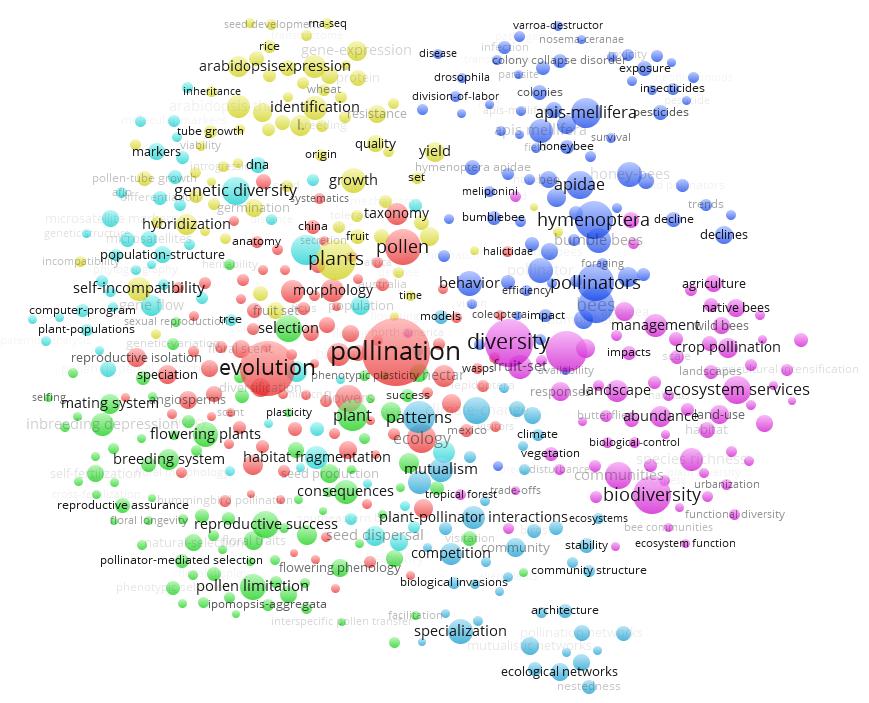 與此同時(shí)我們還通過ESI對(duì)pollination和pollinator等關(guān)鍵詞進(jìn)行檢索,可以大致得出傳粉昆蟲研究領(lǐng)域的現(xiàn)有研究前沿如下:1)常用新煙堿類殺蟲劑對(duì)蜜蜂的殺傷作用;2)野生授粉昆蟲對(duì)農(nóng)業(yè)增收和作物健康的積極影響;3)傳粉昆蟲種群測(cè)量與評(píng)估;4)花朵與傳粉昆蟲的生態(tài)聯(lián)系。通過利用Vos Viewer軟件繪制傳粉生物學(xué)關(guān)鍵詞共現(xiàn)(co-occurrence)聚類圖,獲得傳粉生物學(xué)領(lǐng)域的研究熱點(diǎn)包括:1)傳粉昆蟲的形態(tài)學(xué)、系統(tǒng)進(jìn)化、分類學(xué)方面的研究;2)傳粉昆蟲介導(dǎo)的植物繁殖、選育、選種等的研究,以及花粉限制對(duì)傳粉昆蟲的影響;3)殺蟲劑導(dǎo)致傳粉昆蟲,尤其是蜜蜂、熊蜂的種群下降的影響;4)傳粉昆蟲介導(dǎo)的植物基因表達(dá)、生長、增產(chǎn)等;5)景觀變化、城市化等環(huán)境因素導(dǎo)致生物多樣性降低、傳粉服務(wù)功能下降、傳粉昆蟲群體數(shù)量下降等影響評(píng)估,并提出相關(guān)的控制與管理措施;6)植物-傳粉昆蟲互作與共生、植物與傳粉昆蟲形成的生態(tài)網(wǎng)絡(luò)結(jié)構(gòu)等方面的研究;7)傳粉使植物基因流擴(kuò)散,使植物基因變異和多樣性。