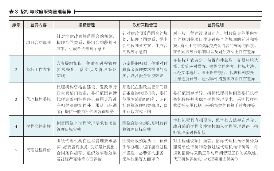 工程建設(shè)項(xiàng)目招標(biāo)管理是指站在建設(shè)全過程視角對招標(biāo)活動(dòng)實(shí)施的一系列管理工作。同理,政府采購管理指采購人針對擬組織實(shí)施的采購活動(dòng)開展的一系列管理工作。政府采購管理過程除遵循財(cái)政預(yù)算控制要求外,依然需將全過程思想貫穿始終。上述兩類活動(dòng)管理目標(biāo)均包括降低過程風(fēng)險(xiǎn)、提升交易效率、確保交易質(zhì)量、滿足全過程管理要求等。招投標(biāo)或政府采購管理工作內(nèi)容均包括:合約規(guī)劃、工作方案編制、代理機(jī)構(gòu)委托、過程文件審核、招標(biāo)與采購代理過程評價(jià)等方面。針對上述內(nèi)容,兩類活動(dòng)有關(guān)差異內(nèi)容詳見表3。